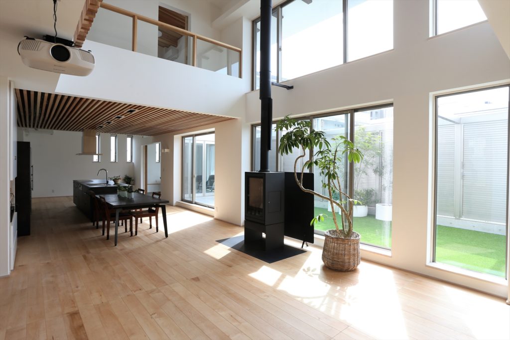 昼は、壁一面の窓からたくさんの光が注ぎます。中庭の芝が照り返しを防ぐので夏でもそれほど暑くなりません。また冬は家の中心にある薪ストーブが家全体を暖めてくれます。