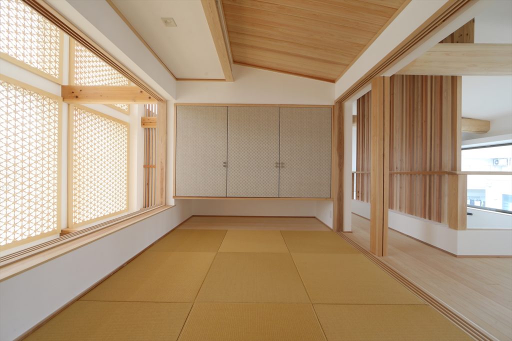 1階は鉄骨。2、3階は木造の3階建て住宅。 シンプルモダンの大空間は明るく、風が通る設計。 大窓には伝統工芸の組子細工の建具がはめられており、視線を遮りながら、優しい明かりを演出します。
