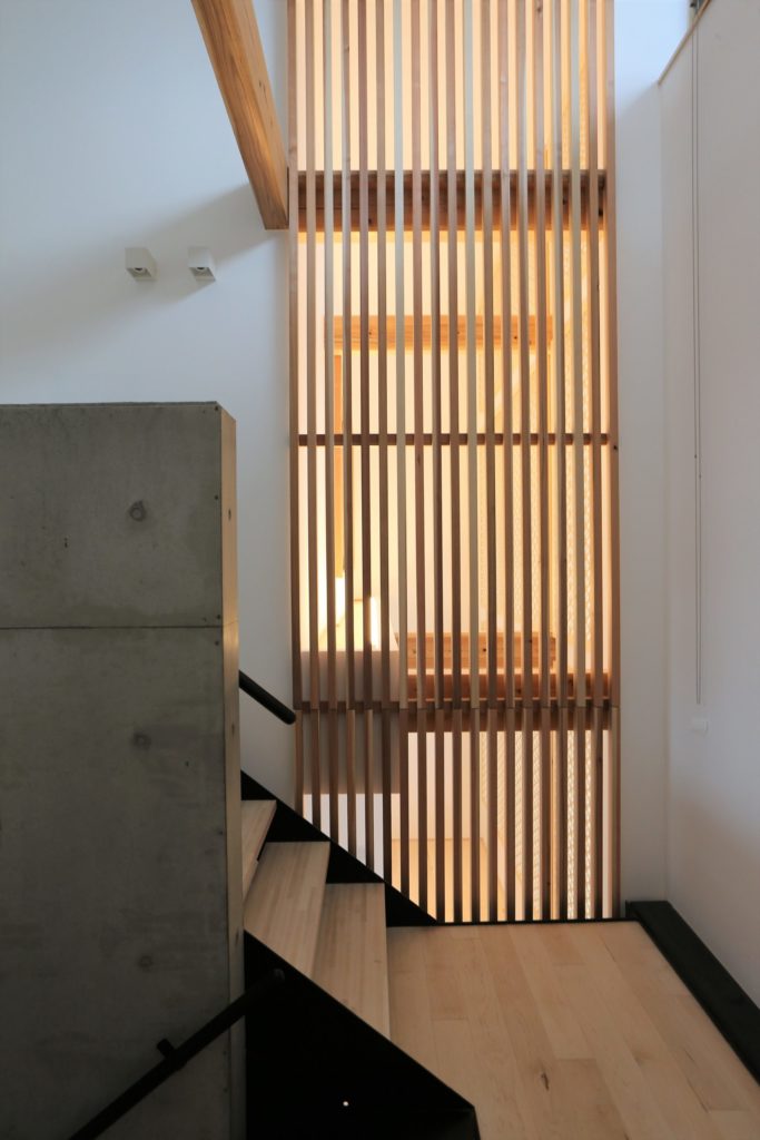 吹き抜けの壁の一部を、全面壮大な縦格子にすれば、自然と視線が上と誘導されます。スリットから優しい光が通り、家の中に柔らかで美しい陰影が生まれます。