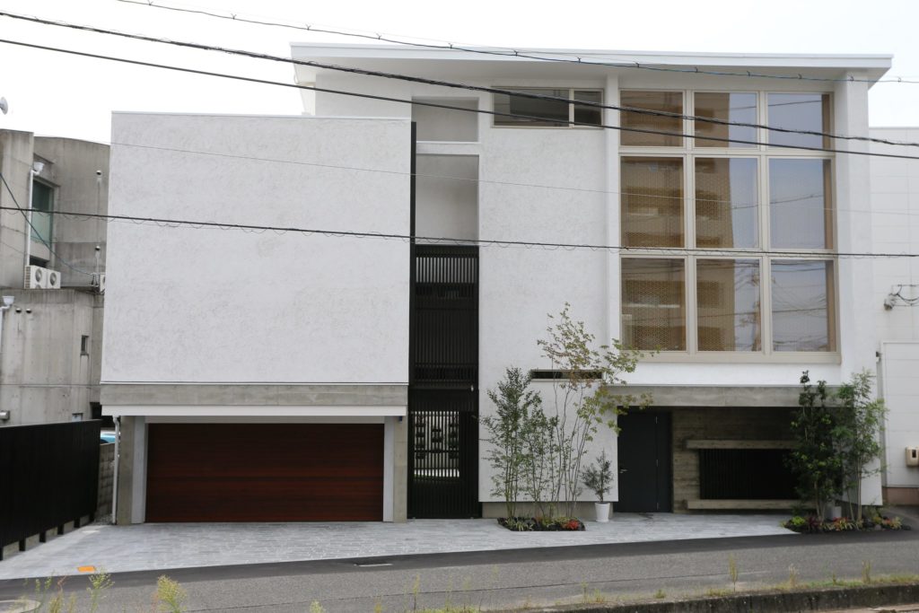 シンプルでモダンな外観。夜は大きな窓から漏れる家の明かり越しに浮かび上がる美しい組子模様が息を飲むほど美しい、ガラリと表情を変える邸です。